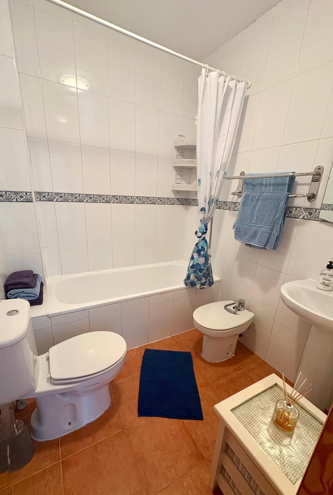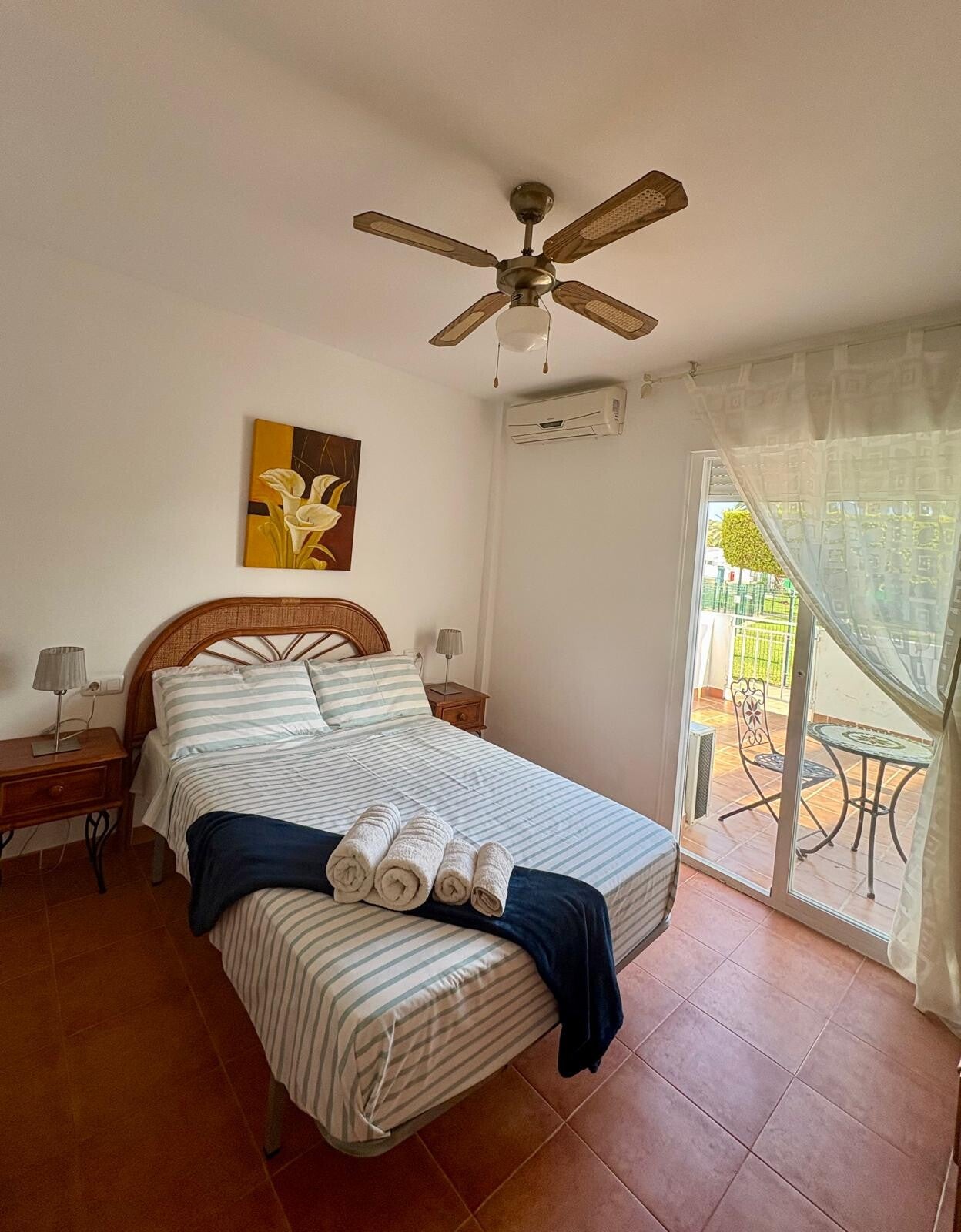 The master bedroom offers direct access to the main terrace, while the second bedroom opens onto a smaller private terrace. All three bedrooms feature air conditioning, and all bedrooms, along with the lounge, have ceiling fans to ensure year-round comfort. The bathroom is thoughtfully designed with a family-friendly layout.